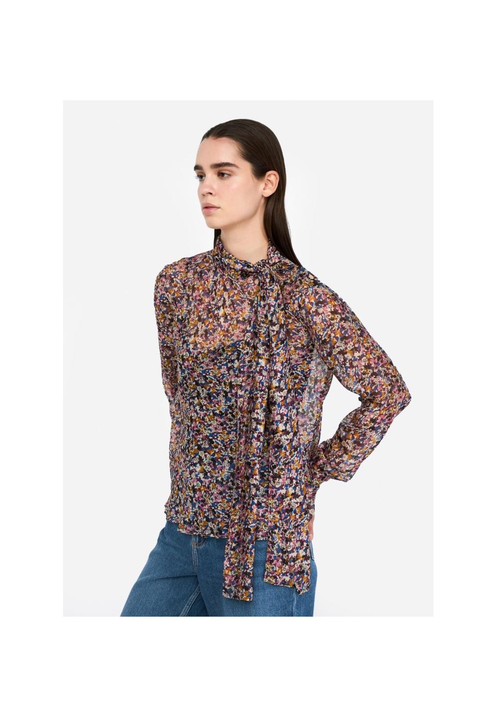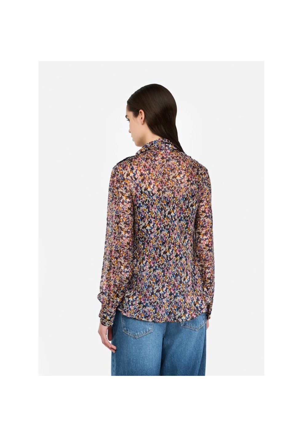 Realizzata in chiffon di misto seta (70% viscosa, 30% seta), questa blusa si distingue per la sua texture fluida e delicata che accarezza la pelle con una sensazione impalpabile di comfort. La stampa floreale all-over, dai toni romantici e raffinati, aggiunge un tocco di colore e movimento, perfetto per valorizzare ogni look con eleganza.