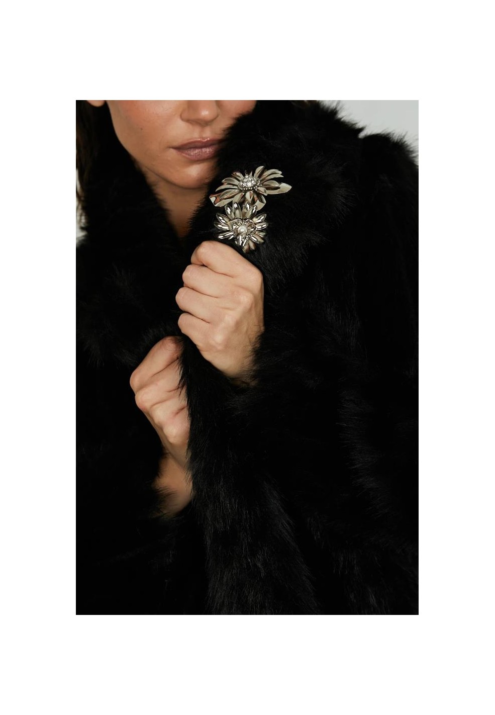 A impreziosire il design ci sono le spille gioiello applicate, piccoli dettagli luminosi che donano un tocco di originalità e raffinatezza, trasformando la giacca in un vero e proprio capo statement. Perfetta da indossare sia di giorno, con look casual chic, sia di sera, per completare outfit eleganti e sofisticati.