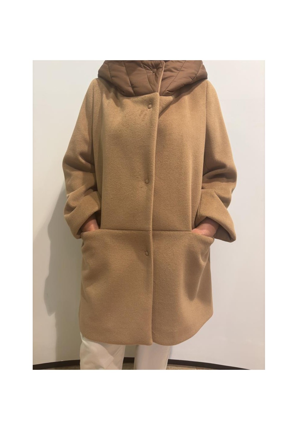 Il design minimal ed elegante è arricchito dal cappuccio imbottito in nylon trapuntato, un dettaglio che non solo assicura protezione nelle giornate più fredde e ventose, ma aggiunge anche un tocco moderno e urbano. La chiusura con bottoni a pressione invisibili mantiene il look pulito ed essenziale, mentre le ampie tasche frontali aumentano la funzionalità senza compromettere lo stile.