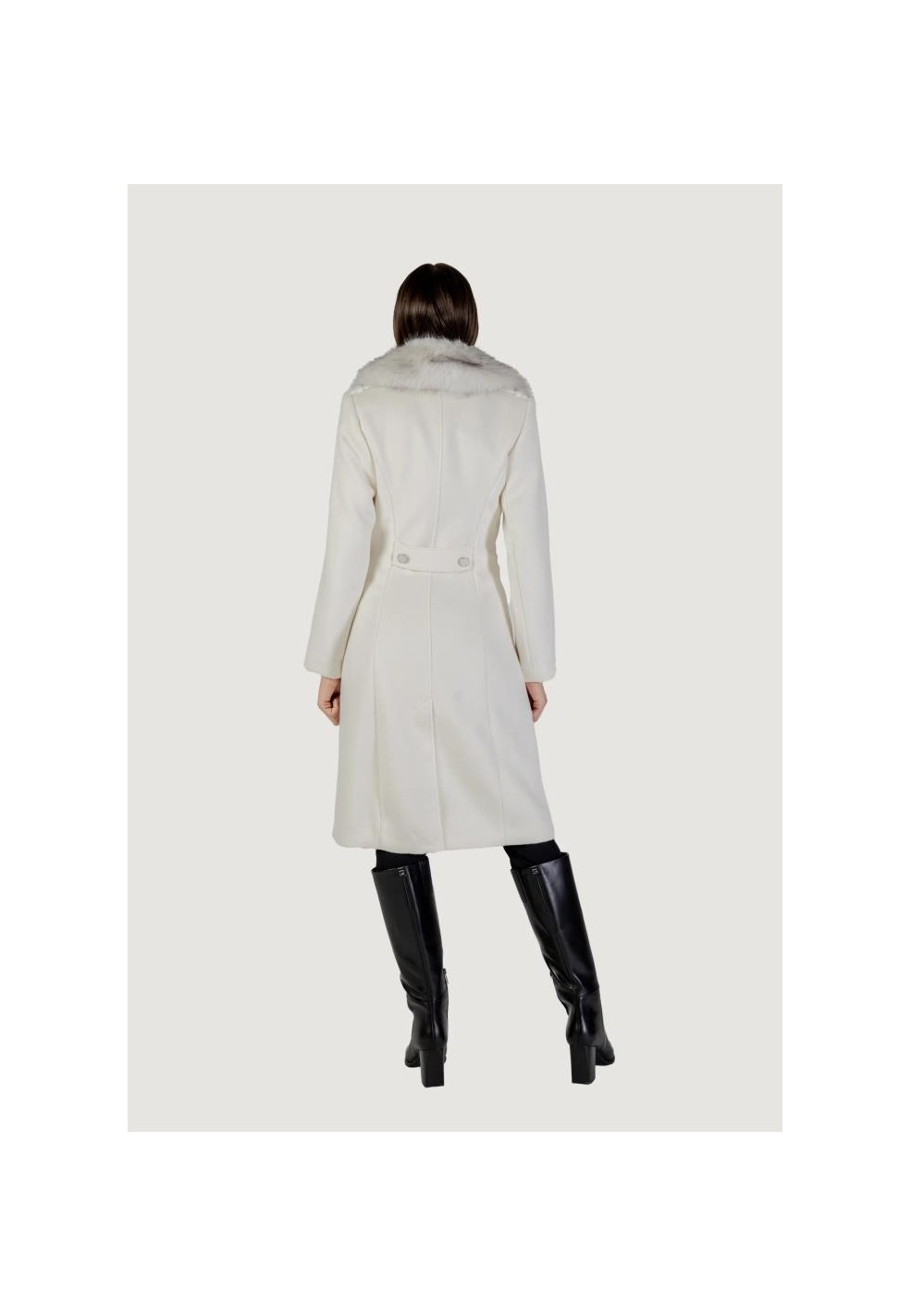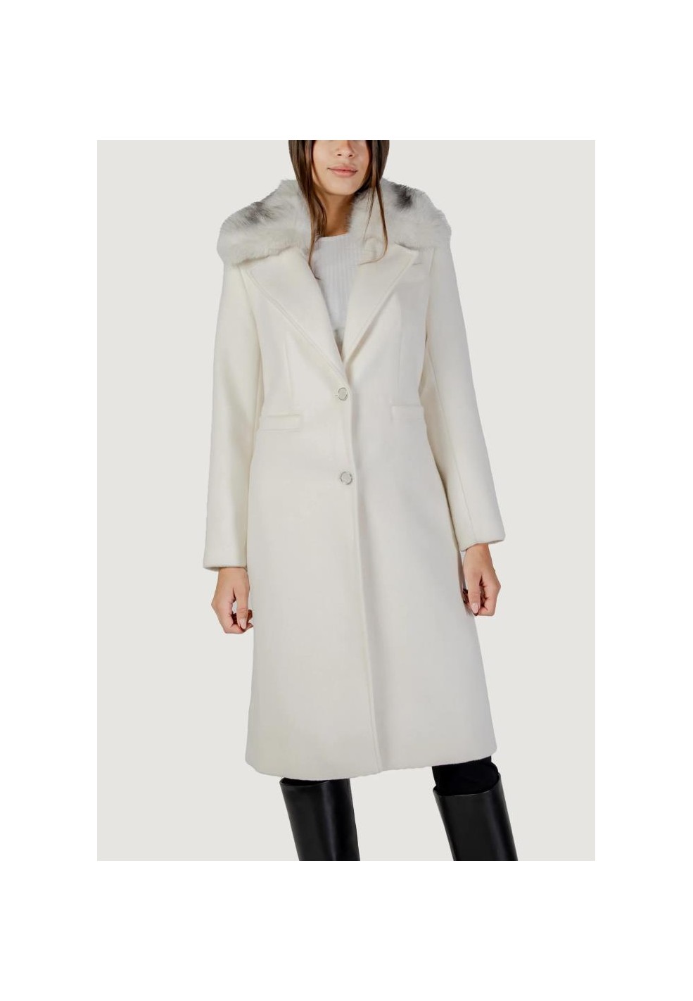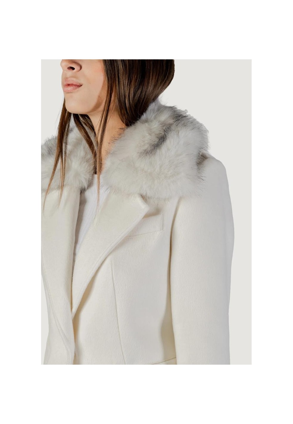Il design è arricchito da ampie revers e un sofisticato collo in pelliccia sintetica, elemento distintivo che aggiunge un tocco glamour e chic al modello. Il collo, oltre ad avere un valore estetico, aumenta il comfort termico nelle giornate più fredde. Le maniche lunghe e la chiusura frontale con bottoni assicurano praticità e una vestibilità classica, perfetta sia per look da giorno che da sera.