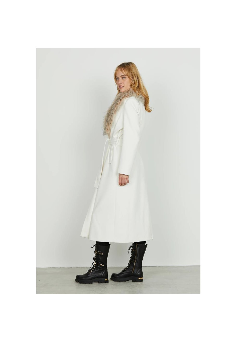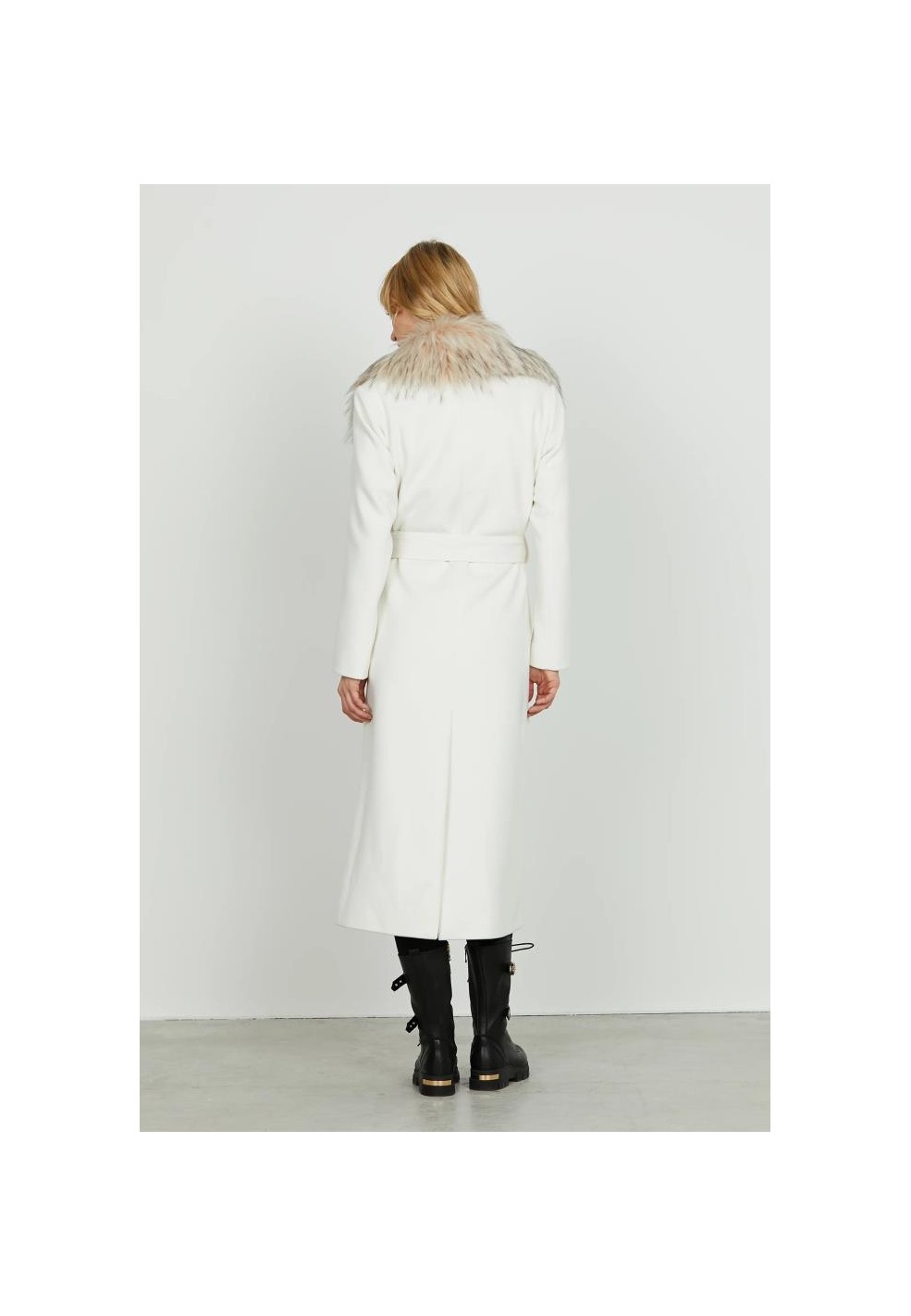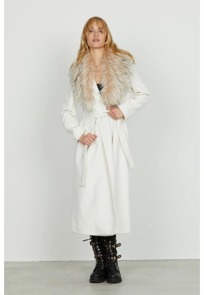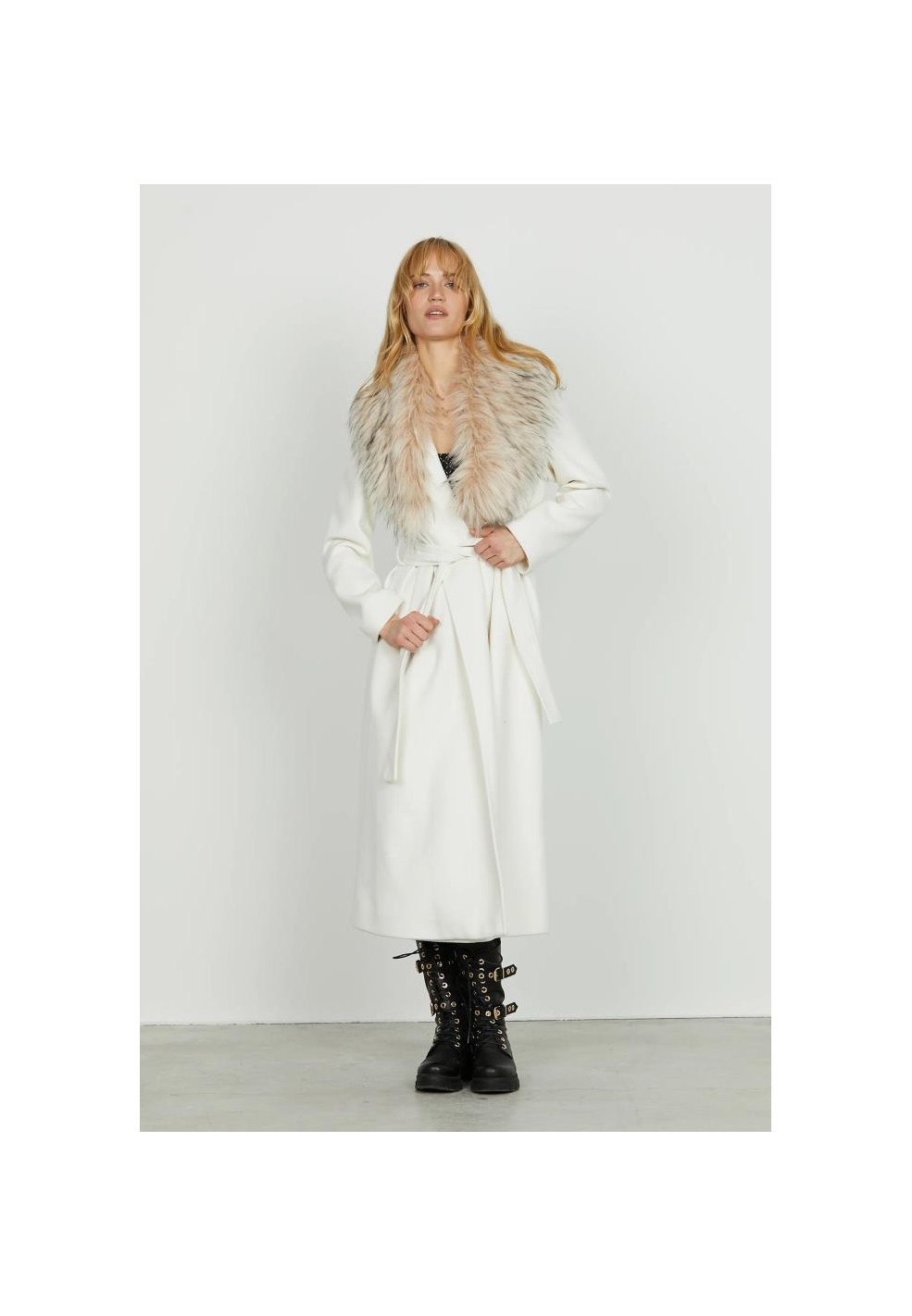 Il design classico viene impreziosito da dettagli moderni e versatili: il collo con ecopelliccia staccabile offre la possibilità di personalizzare il look in base alle esigenze, indossandolo per un effetto glamour nelle giornate più fredde oppure rimuovendolo per uno stile più minimal ed essenziale. La cintura in vita sottolinea la silhouette con delicatezza, aggiungendo femminilità e definizione alla linea lunga del cappotto.