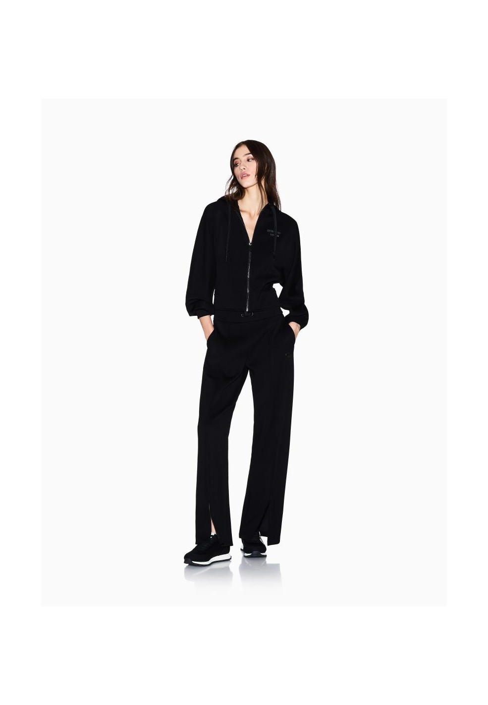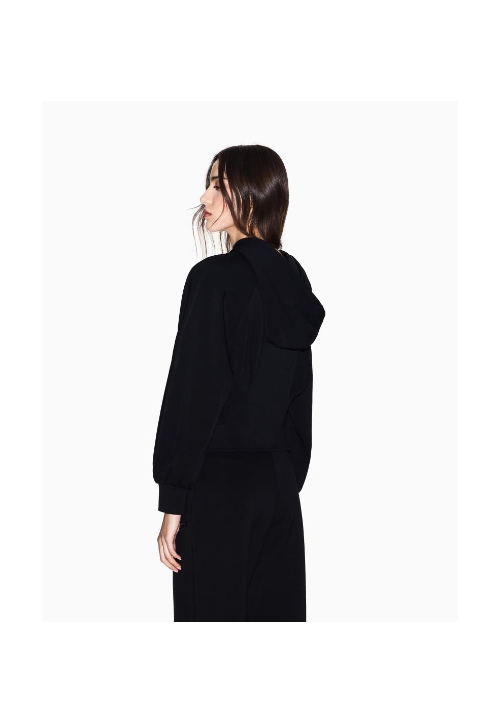Realizzata con un tessuto principale composto da 56% poliammide, 36% viscosa e 8% elastan, offre una vestibilità morbida, flessibile e resistente all’usura quotidiana. Il cappuccio, foderato interamente in viscosa, garantisce comfort e leggerezza, rendendo questo capo ideale sia nelle stagioni più fresche che durante le giornate di mezza stagione. I dettagli in maglia, realizzati in 95% cotone e 5% elastan, arricchiscono il design, creando contrasti di texture che valorizzano il capo e ne esaltano la modernità.