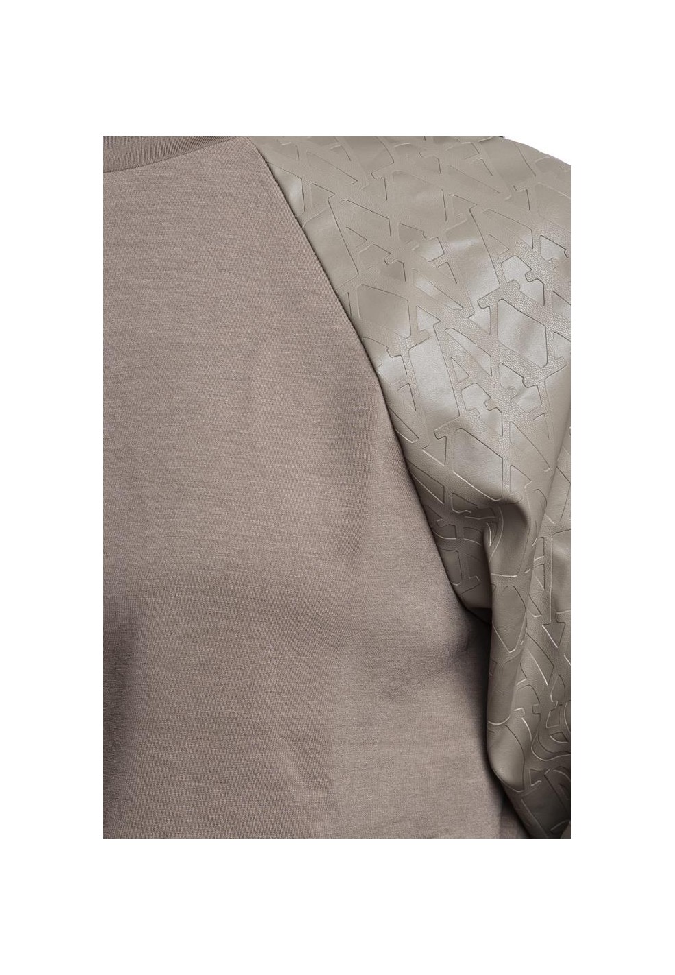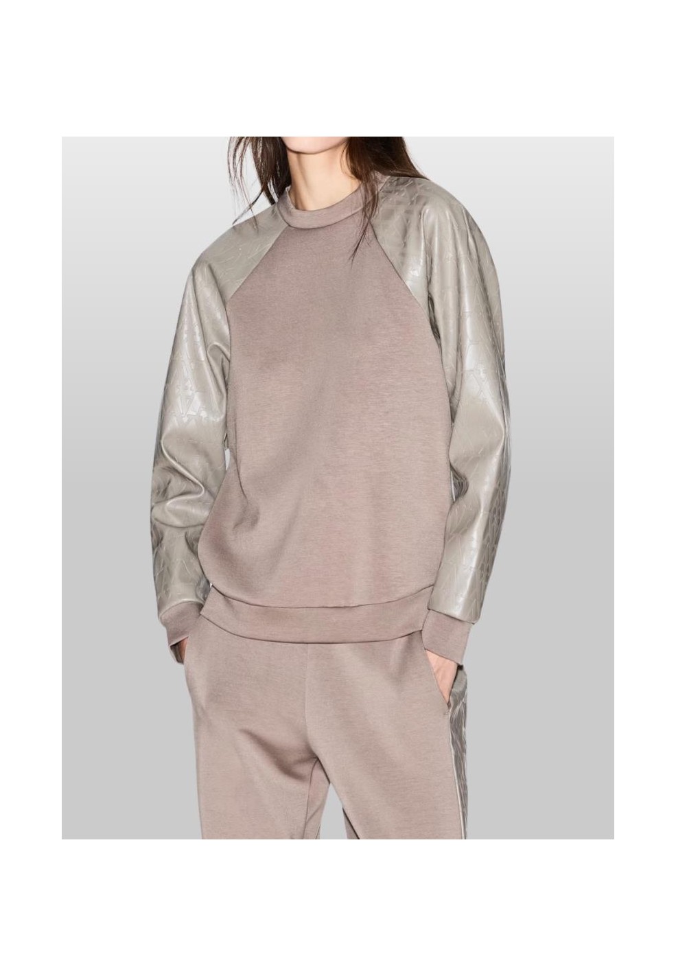Il design è essenziale ma arricchito da dettagli che fanno la differenza: il girocollo classico la rende versatile e facile da indossare, mentre le maniche lunghe con taglio raglan in similpelle donano un tocco moderno e sofisticato, perfetto per la donna che cerca un capo dallo stile deciso. Il monogramma all over embossato tono su tono è un elemento distintivo che esalta l’identità Armani Exchange, conferendo raffinatezza senza risultare eccessivo.