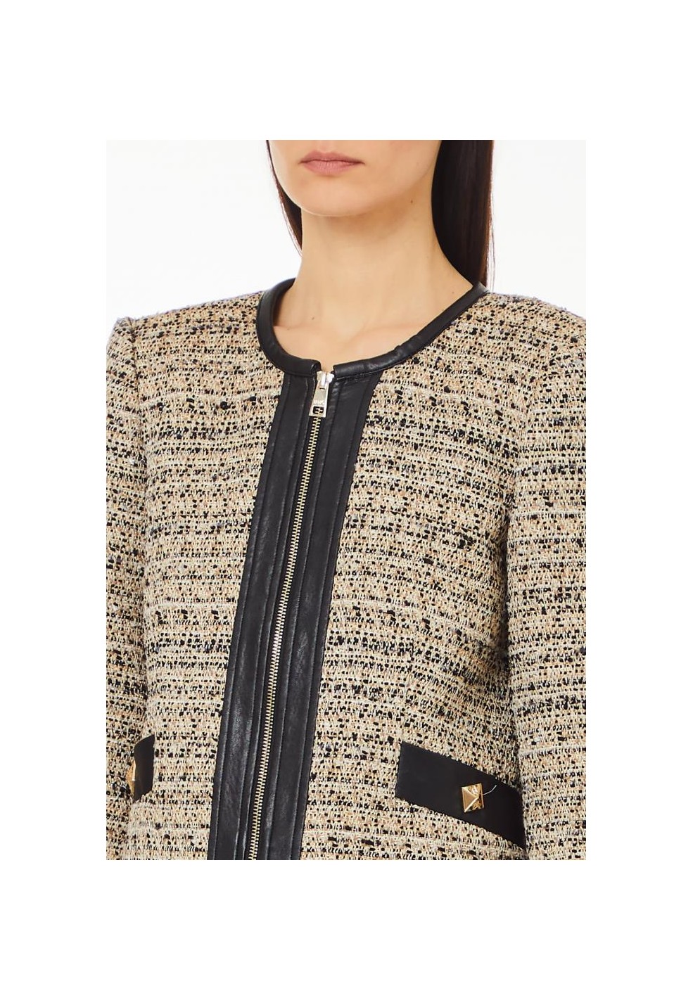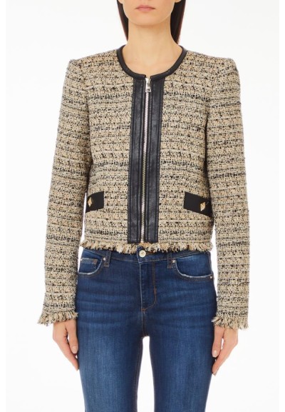 Il design presenta uno scollo tondo essenziale, senza revers, che rende la giacca versatile e facile da abbinare a diversi outfit. La chiusura frontale con zip è resa ancora più esclusiva dai profili in similpelle a contrasto, che esaltano i dettagli e creano un mix perfetto tra classico e contemporaneo. Le tasche a filo in vita, anch’esse bordate in similpelle, sono arricchite da una raffinata applicazione metallica con logo, che sottolinea l’attenzione ai particolari tipica di Liu Jo.