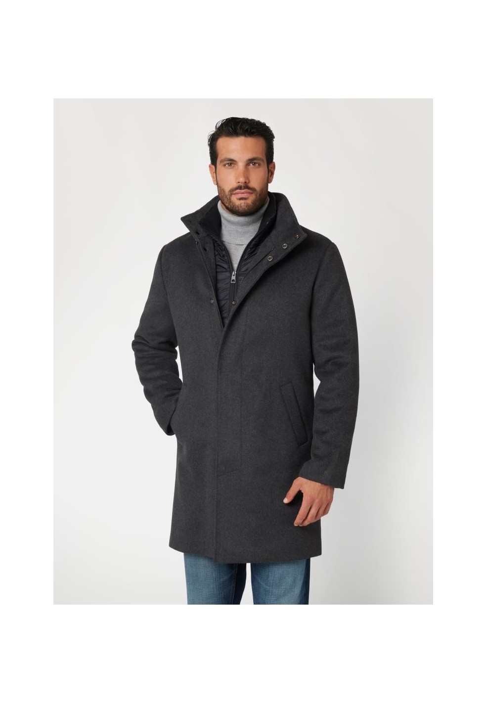 Il design include una parte frontale rimovibile, che lo rende estremamente versatile e adatto a diverse condizioni climatiche. Il collo alto protegge efficacemente dal freddo, mentre le maniche lunghe e la vestibilità slim esaltano la silhouette maschile, garantendo un look elegante e contemporaneo.