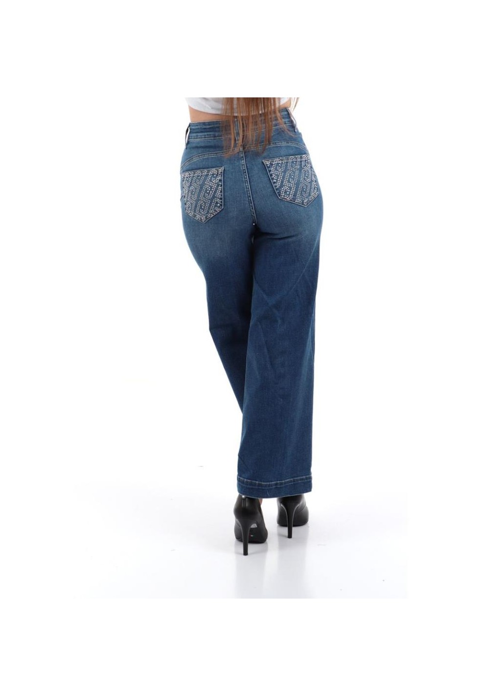 Il vero dettaglio distintivo è sul retro: le tasche posteriori impreziosite da applicazioni strass creano un accento luminoso che caratterizza il capo con un glamour raffinato, senza risultare eccessivo. Brillano con eleganza sia con i look da giorno che da sera, rendendo questo modello perfetto per chi ama un denim ricercato e femminile.