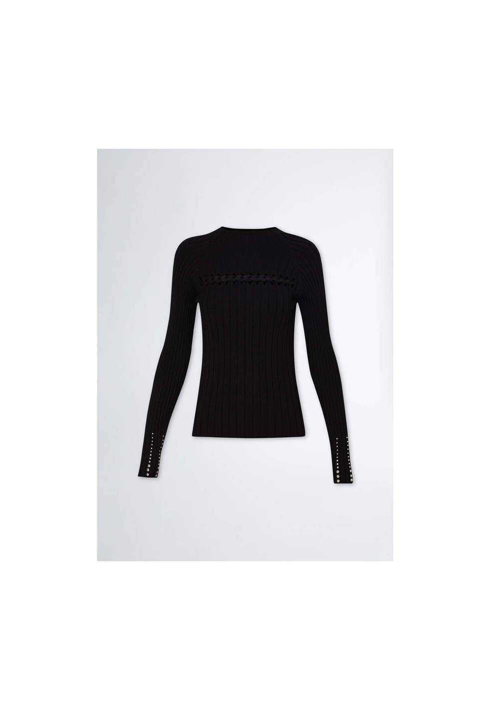 Il design è caratterizzato da una lavorazione a coste, che conferisce movimento e struttura al capo, adattandosi in maniera armoniosa alle forme del corpo. Sul davanti spicca un raffinato motivo a treccia, ispirato ai classici maglioni invernali ma reinterpretato in chiave moderna e fashion. A completare il look ci sono le borchie applicate, che donano luminosità e un tocco glamour, rendendo questa maglia un elemento distintivo del guardaroba.