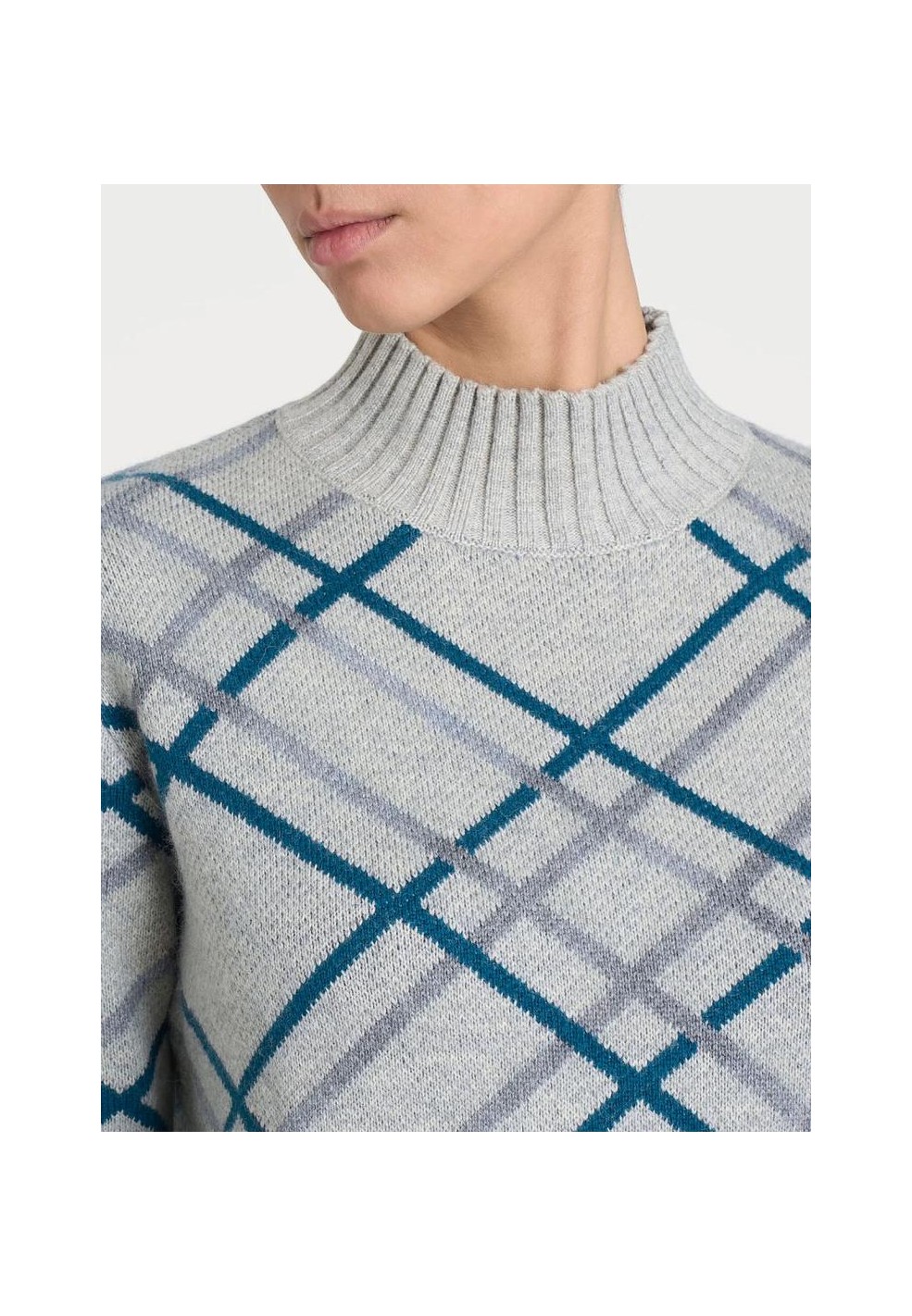 La fantasia check all-over arricchisce il design con un effetto grafico sofisticato e contemporaneo, capace di donare carattere anche ai look più minimal. Il collo alto morbido — tipico del modello lupetto — avvolge delicatamente il collo senza costringere, mentre la bordatura in costina 3x3 tinta unita definisce con eleganza lo scollo e aggiunge un dettaglio sartoriale distintivo.