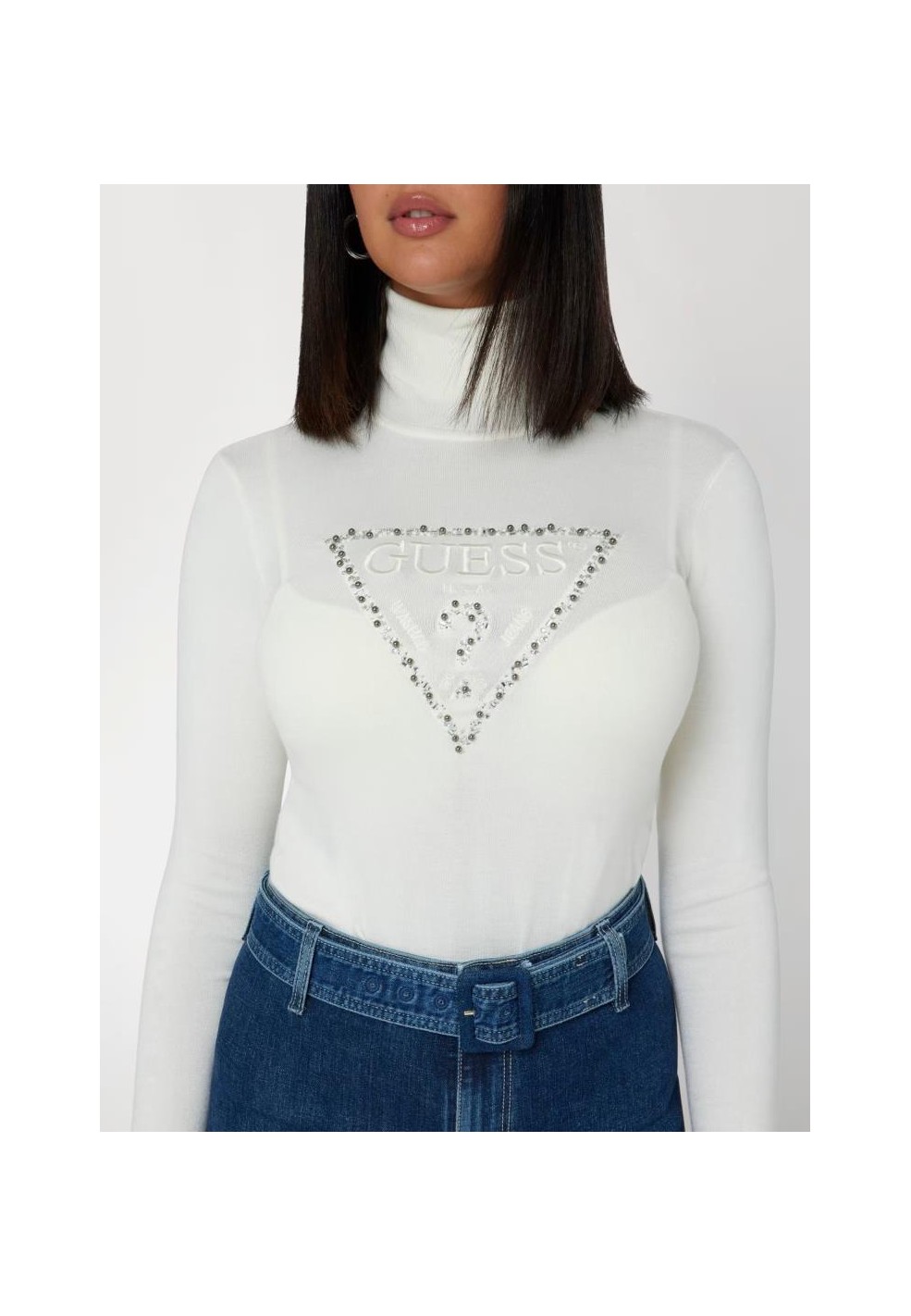 La maglia Guess con logo triangolo e strass è il capo perfetto per chi cerca eleganza e comfort in un'unica soluzione. Realizzata in misto viscosa, questa maglia si distingue per la sua morbidezza al tatto e la vestibilità slim che esalta la silhouette femminile. Il logo triangolo Guess decorato con strass sul davanti aggiunge un dettaglio glamour, rendendo questa maglia ideale per look casual-chic o raffinati.