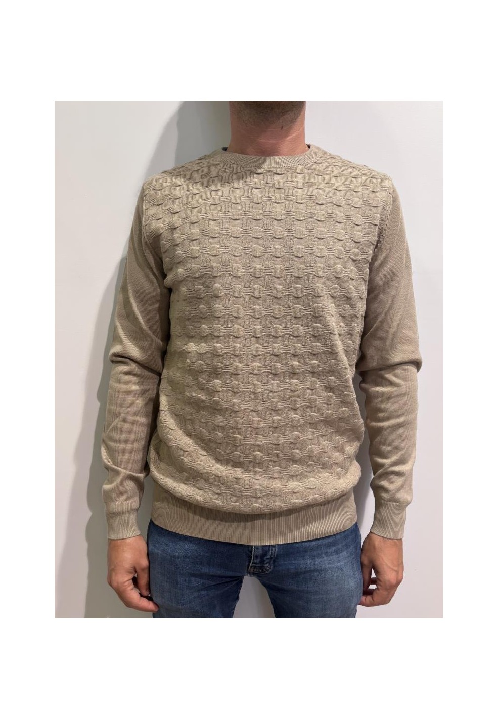 Il design a girocollo classico la rende estremamente versatile, adatta a molteplici occasioni e facilmente abbinabile a jeans, pantaloni casual o chino. Ciò che la distingue è la lavorazione a rilievo geometrico sul davanti, un dettaglio raffinato che arricchisce il capo e dona un tocco contemporaneo e originale. Le maniche e il retro sono lisci, creando un elegante contrasto di texture che valorizza la silhouette maschile.