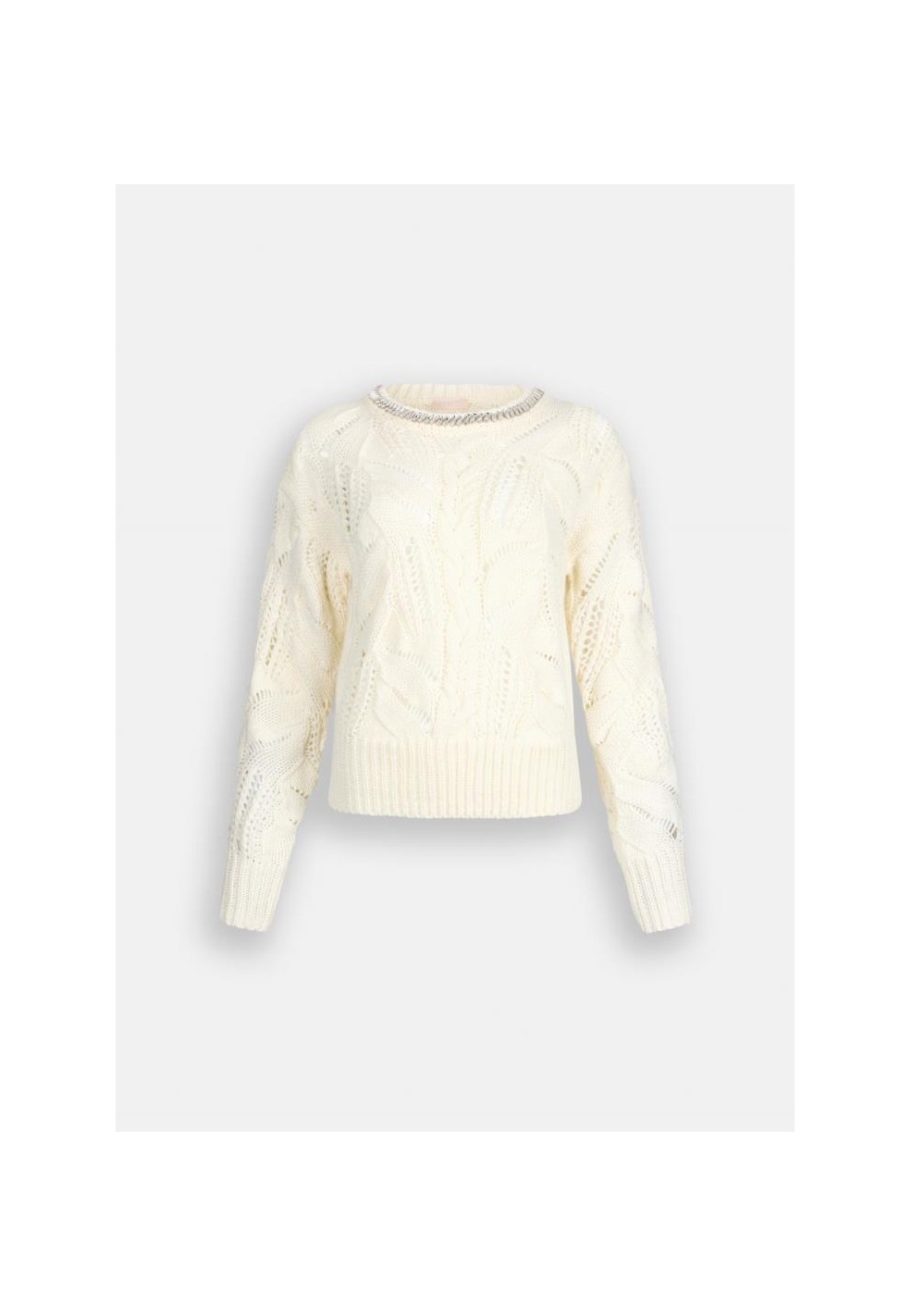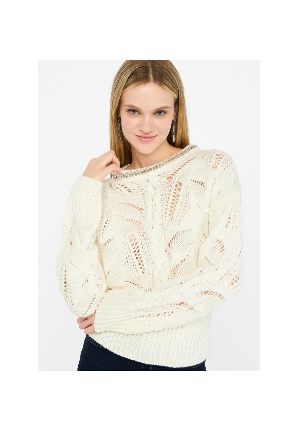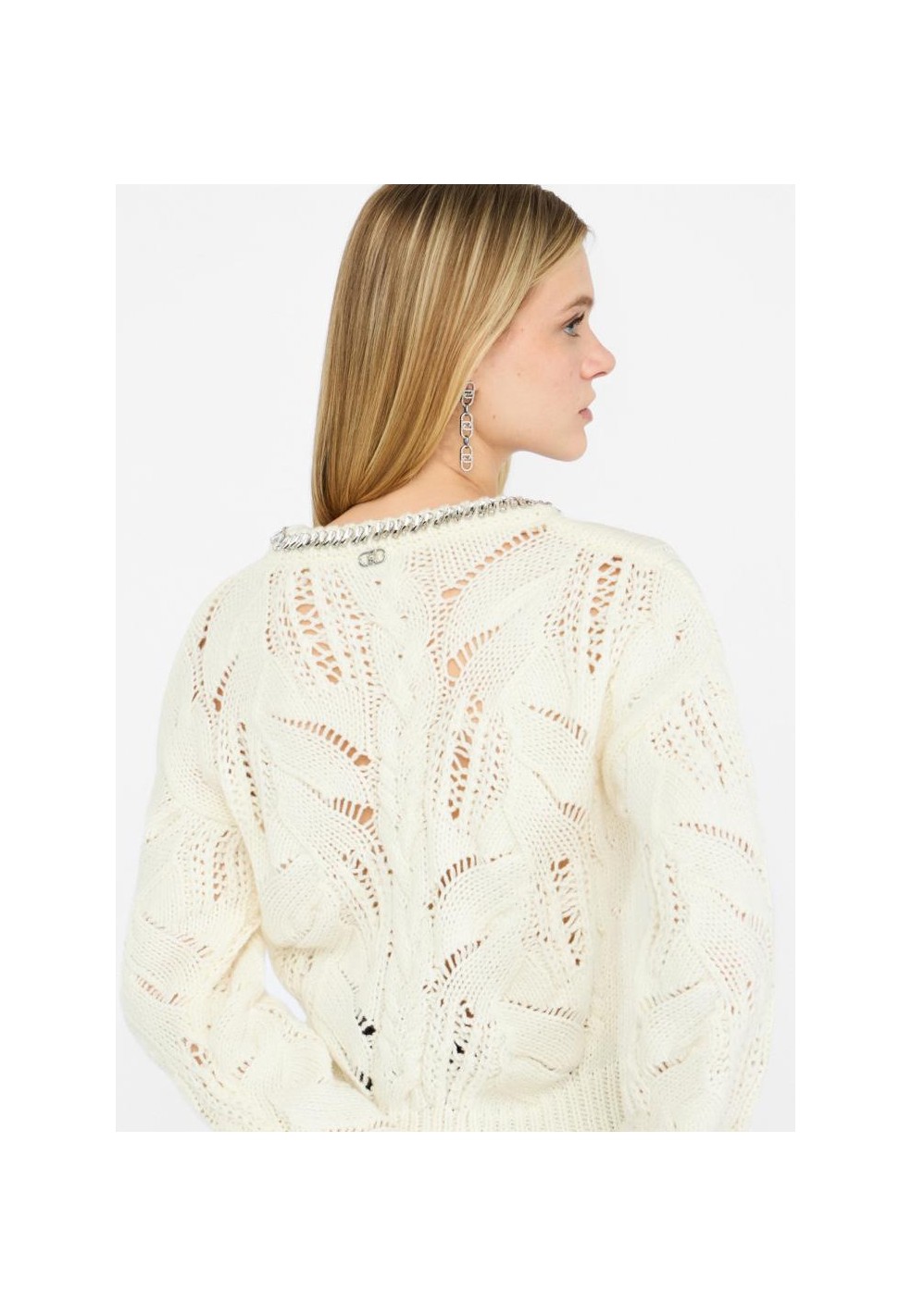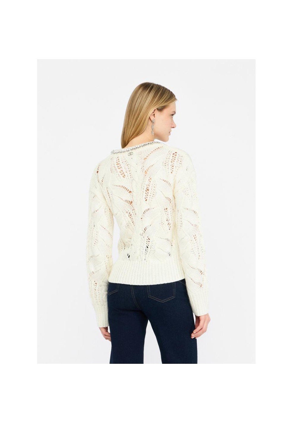 Il design si distingue per la lavorazione traforata, che dona leggerezza e movimento al capo, rendendolo perfetto per abbinamenti casual chic o per look più ricercati. Le pietre gioiello applicate sul davanti aggiungono un tocco glam e luminoso, trasformando una maglia in un vero e proprio accessorio moda.