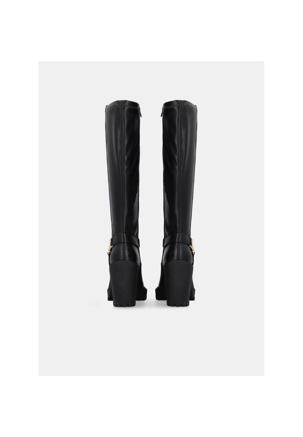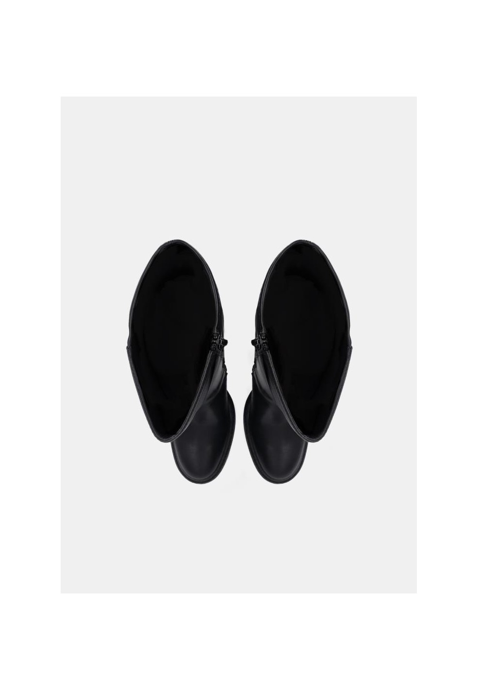 Il design elegante è arricchito dal logo monogram e dal tacco largo da 10 cm, che garantisce stabilità e slancio alla figura. La suola con plateau da 2,5 cm dona ulteriore comodità, attenuando la percezione dell’altezza del tacco e rendendo questi stivali ideali anche per un utilizzo prolungato.