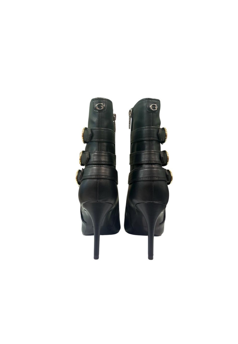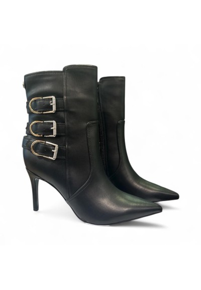 Gli stivaletti Guess Ricaly da donna rappresentano l’incontro perfetto tra sensualità, femminilità e carattere deciso. Realizzati in similpelle nera di alta qualità, si distinguono per la silhouette affusolata con punta sfilata, ideale per slanciare otticamente la gamba e conferire un’eleganza senza tempo.