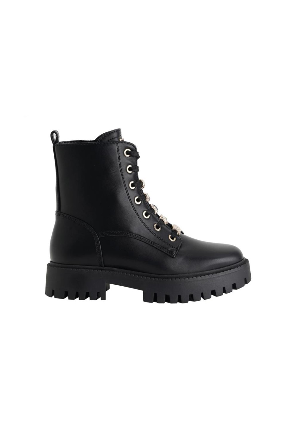 La tomaia in ecopelle nera dal finish liscio e resistente esalta la struttura del modello, mentre gli strass brillanti applicati sui lacci trasformano un design militare in un accessorio ultra femminile e fashion. Un dettaglio scenografico che cattura subito l’attenzione e illumina qualsiasi outfit, dal più semplice al più sofisticato.