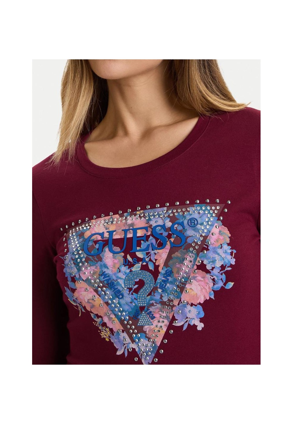 Il girocollo essenziale e le maniche lunghe le conferiscono un tocco versatile e sobrio, ideale anche come sottogiacca. L’elemento che la rende unica è il logo Guess a triangolo, decorato con motivi floreali e dettagli in strass, che dona luce e femminilità al capo, trasformandolo in un vero e proprio statement di stile.