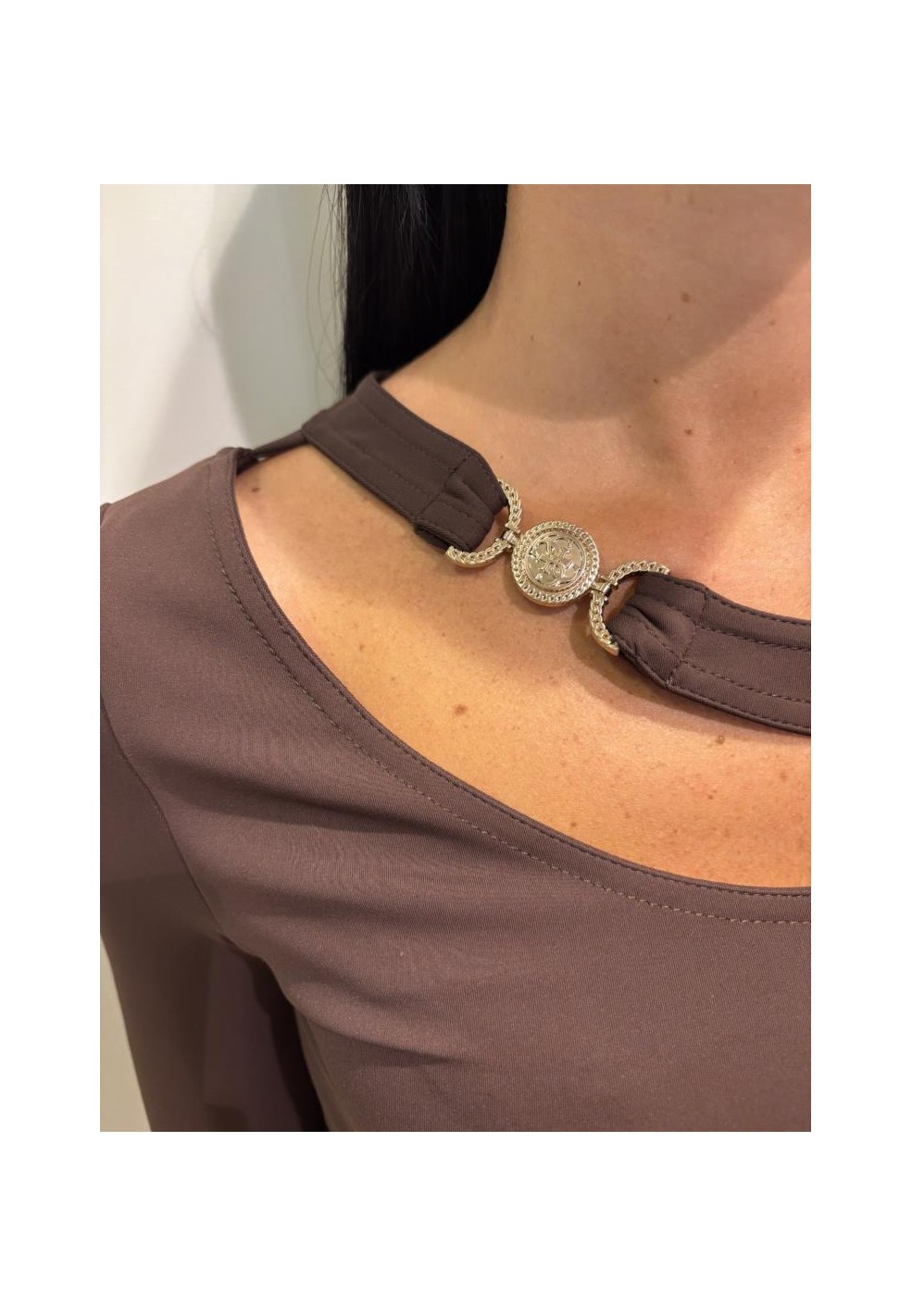 Il design si caratterizza per la particolare apertura frontale cut out, impreziosita da una fibbia dorata che diventa il dettaglio glamour del capo. Lo scollo posteriore aggiunge un tocco sensuale e raffinato, mentre le maniche lunghe lo rendono adatto anche alle stagioni più fresche. La vestibilità regular garantisce comfort e libertà di movimento, adattandosi perfettamente alla taglia prescelta.