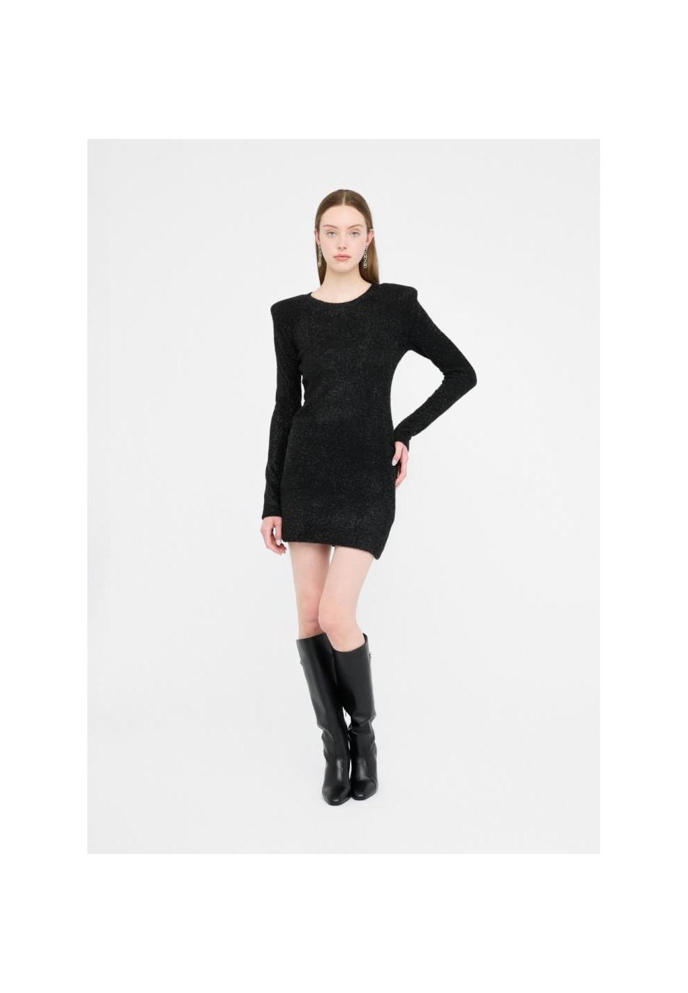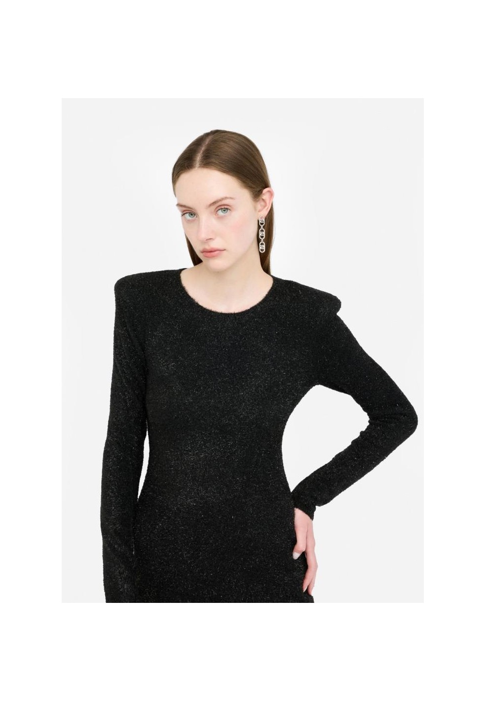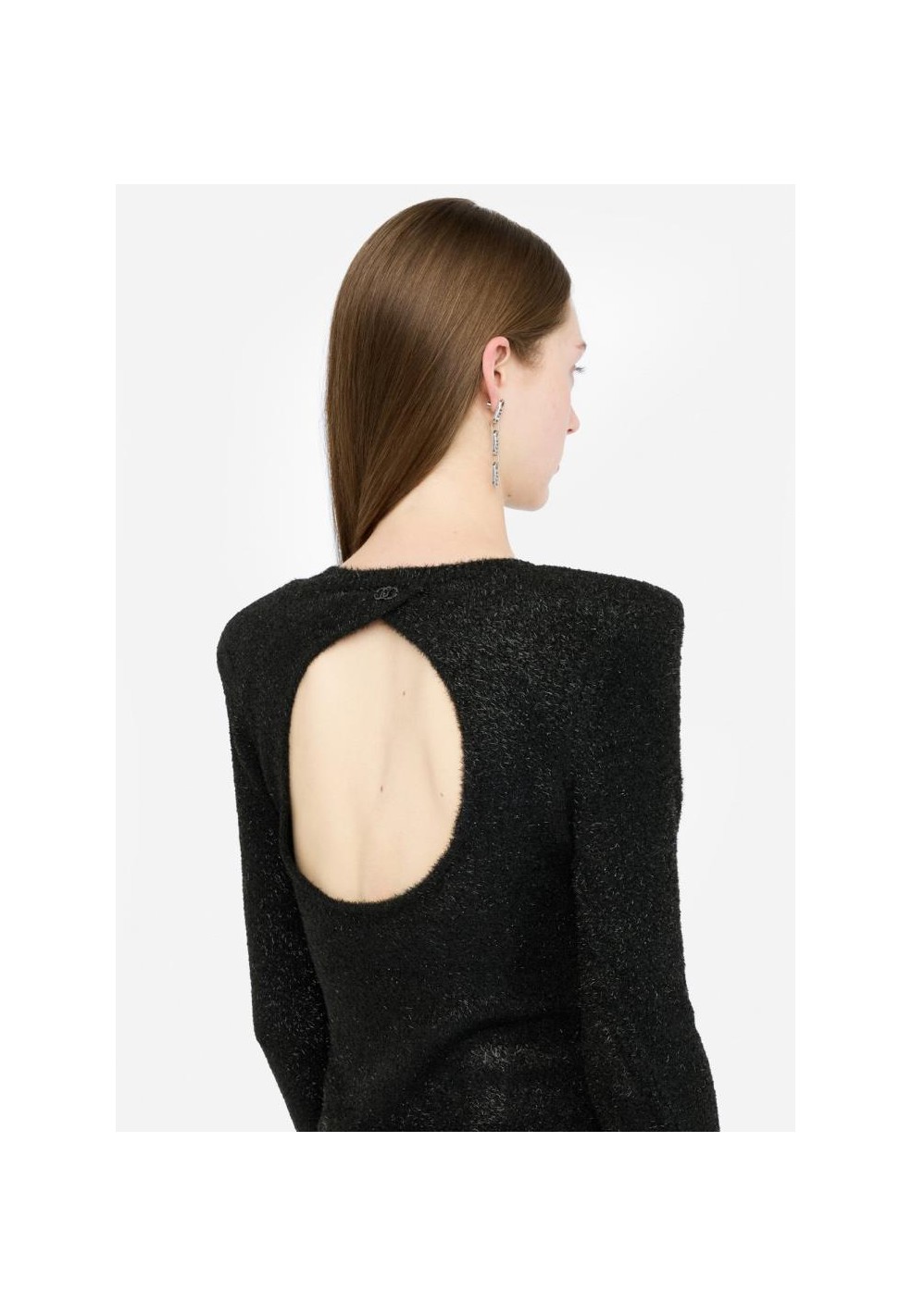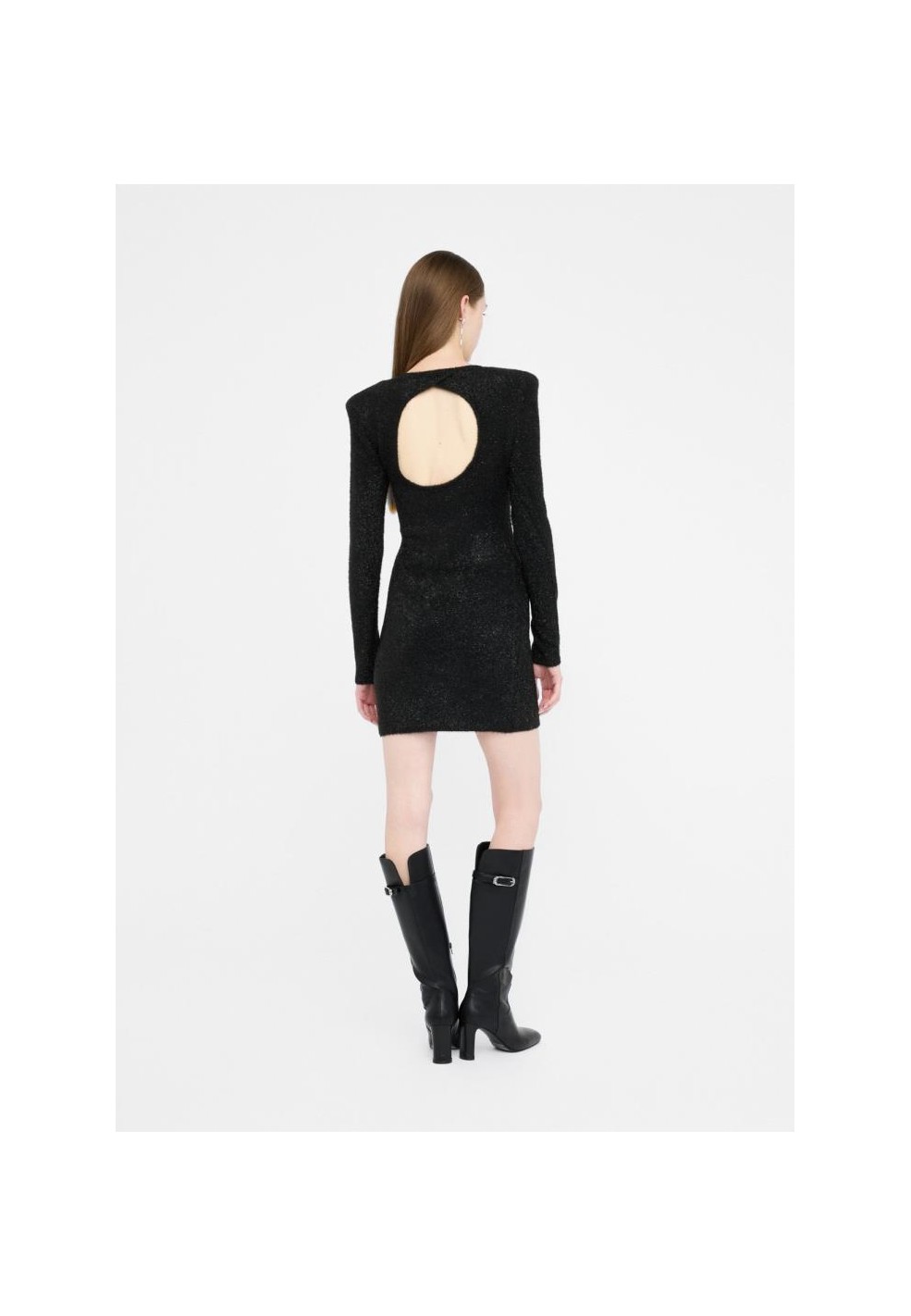 Il design si caratterizza per l’effetto sparkling, che dona luminosità al capo rendendolo perfetto per occasioni speciali, feste o serate glamour. Le spalline imbottite conferiscono struttura e un tocco deciso alla linea, bilanciando armoniosamente le proporzioni. Le maniche lunghe aggiungono eleganza, mentre il cut-out sul retro crea un dettaglio sensuale e moderno che rende l’abito unico.